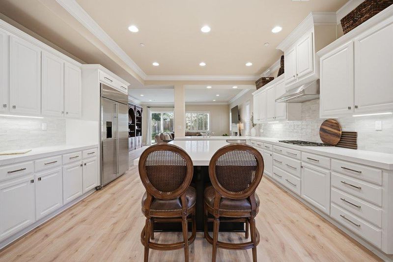 Cooktop - Gas, Countertop - Quartz, Dishwasher, Exhaust Fan, Freezer, Garbage Disposal, Hood Over Range, Ice Maker, Island, Microwave, Oven - Built-In, Oven - Double, Oven - Electric, Pantry, Refrigerator